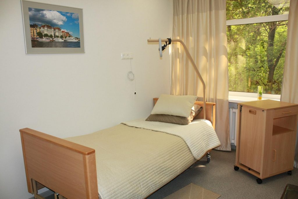 Уютные палаты оснащены оборудованием для ухода за тяжелобольными пациентами, медицинскими кроватями с ортопедическими подушками, кнопками вызова персонала и телевизорами.